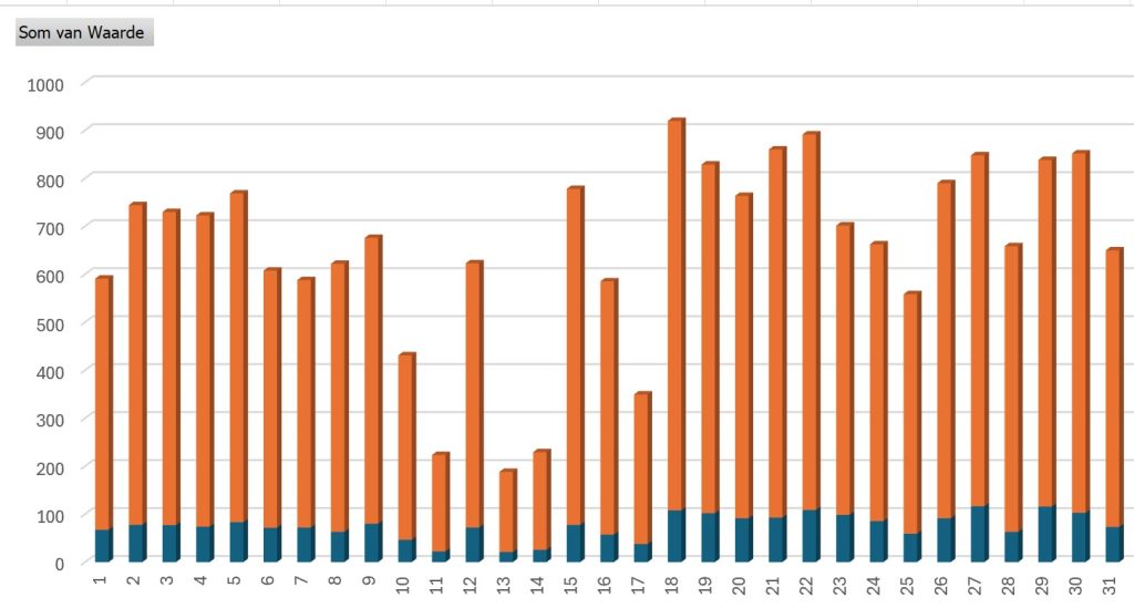 De maand november was goed in vergelijking tot vorige jaren met een totaal van 6707 KwH voor de maand november, de beste dag was op 7 november met 438 KwH en 16 november was met 53 KwH de dag met de minste opbrengsten.