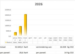 Januari 2026 was de slechtste januari sinds de oprichting maar dat heeft een oorzaak. Door de sneeuw, die lang is blijven liggen is er een fors aantal dagen bijna geen opbrengst geweest. dat is duidelijk zichtbaar in onderstaande tabel. Totaal was er een opbrengst van 3364 kWh deze maand.